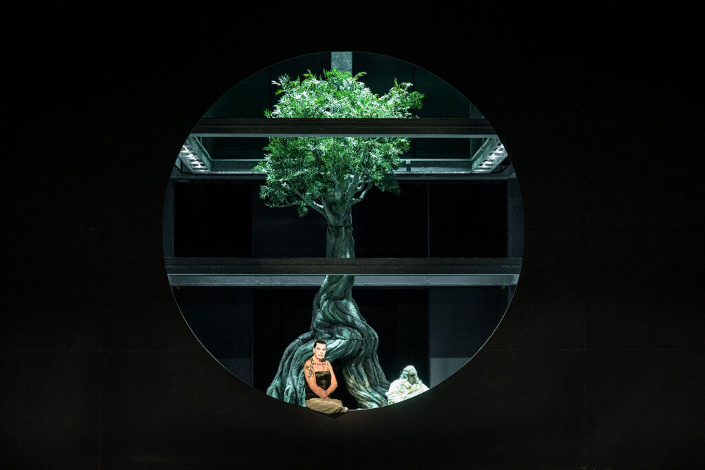 And Wotan had already been at the World Tree before. This only becomes clear right at the very end of the plot. At the central stage element (set design by Boris Kudlička and Kateřina Hubená) of the World Tree, whose primitive and skeletal form is modelled on Lars von Trier’s film ‘Antichrist’ and which possesses a cave in its centre resembling a vulva, a man approaches the tree to the sounds of the prelude to copulate with the naked, long-haired woman crawling out of the vulva-cave (video by Andreas Deinert). Depending on one’s perspective, this marks either the beginning or the end (“little death”) of the mythological primal state; it is both Alpha and Omega, as well as Eros and Thanatos. In any case, the end of this state is already foreshadowed in the orchestra pit by the E-flat major chord emerging from the primordial soup. After all, the course of the world is soon to be thrown into a delicate imbalance on stage as well, through Alberich’s condemnation of love.